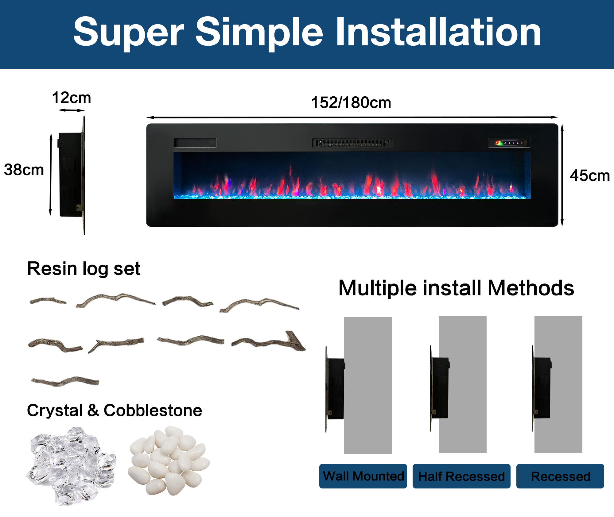 The fireplace can be wall-mounted or recessed into the wall, with an included mounting bracket that allows two people to easily and safely complete the installation. It comes with a detailed installation guide and fixing tools, and it can be plugged into a standard household power outlet for immediate use, offering a convenient user experience.