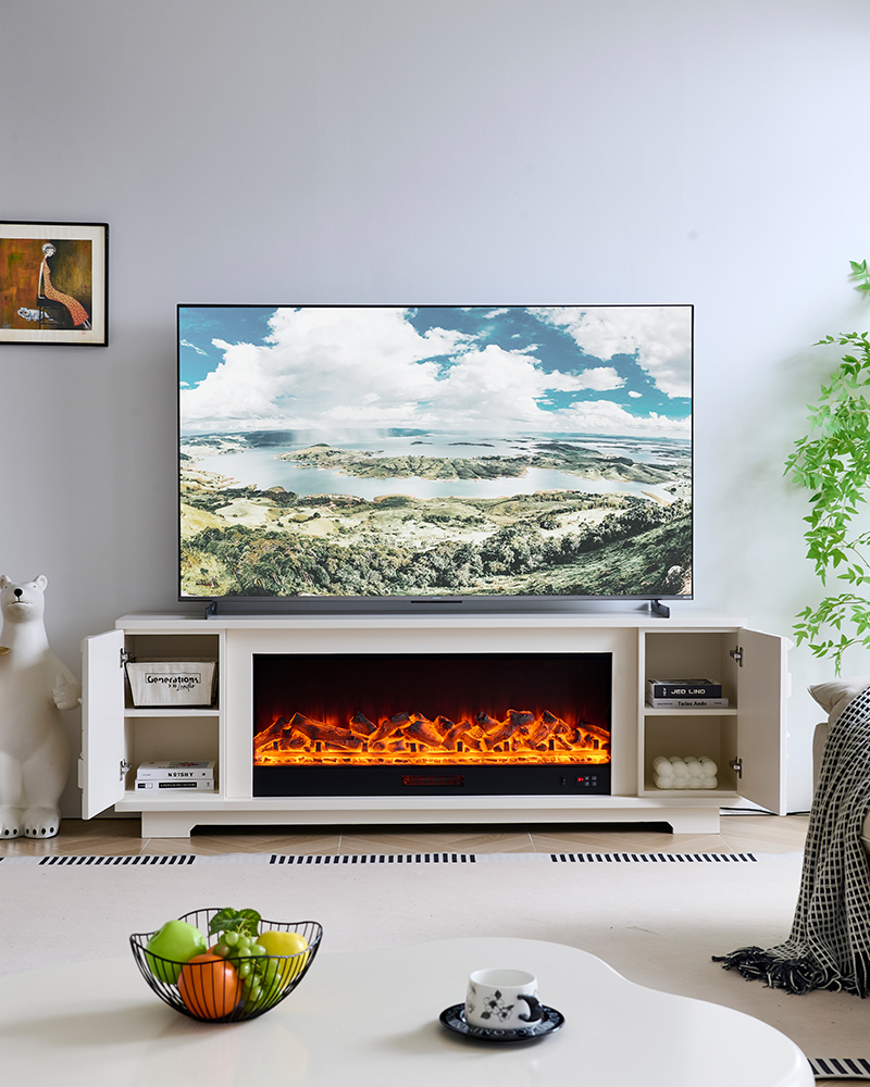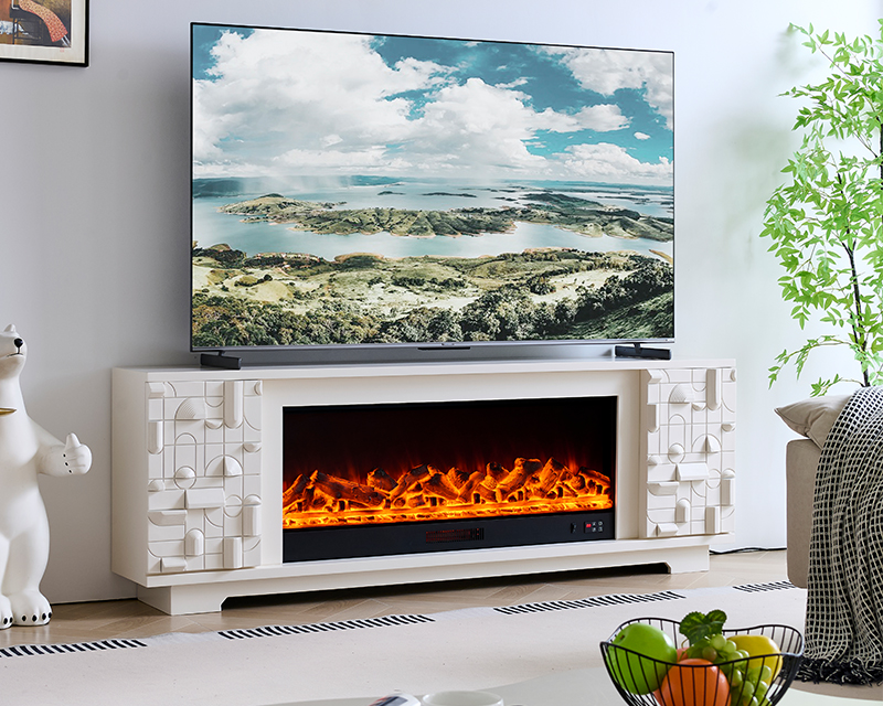 The Vortex is a high-end contemporary tv stand fireplace that integrates modern design, exceptional functionality, and artistic aesthetics. The cabinet is made of warm off-white E0-grade solid wood, and its unique three-dimensional geometric relief design makes it a modern work of art that showcases personality. This multi-functional unit not only safely supports TVs weighing up to 300 kg, but its ample storage space on both sides also meets daily storage needs. The built-in electric fireplace supports remote operation, offers up to 5 RGB flame colors, and can be temperature-controlled as needed, making it suitable for year-round use. With its unique design and high-quality materials, the VortexFlame series is an ideal choice for you to expand your product line and attract high-end consumers.